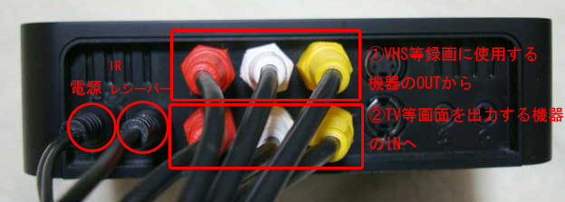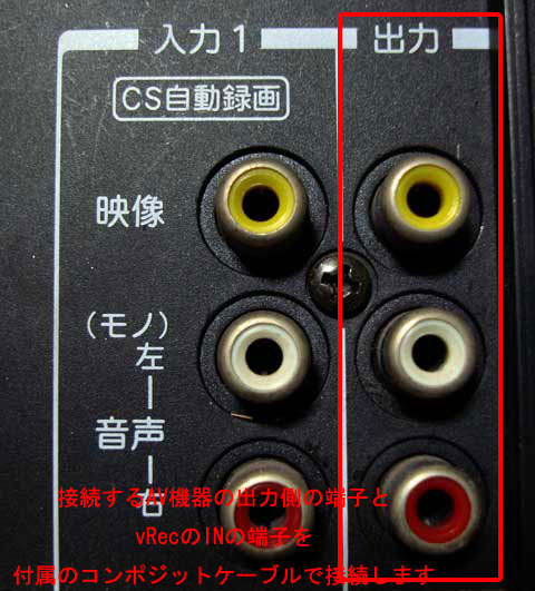 付属のコンポジットケーブルの一端を接続し、もう一方をvRec+の背面部のINと書かれた
