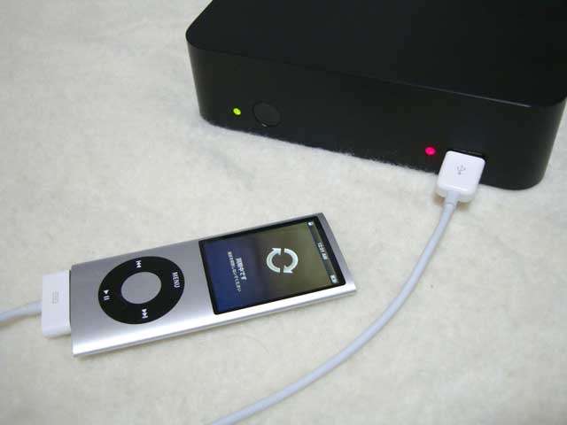 リモコンの電源ボタンを押し、vRec+の電源を入れ、iPodをケーブルで接続します。