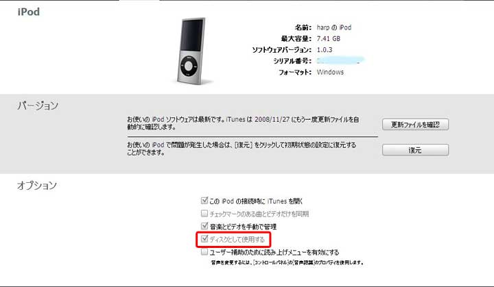 PCまたはMACにiPodを繋ぎ、iTunesを立ち上げた後、iPodのオプション画面で